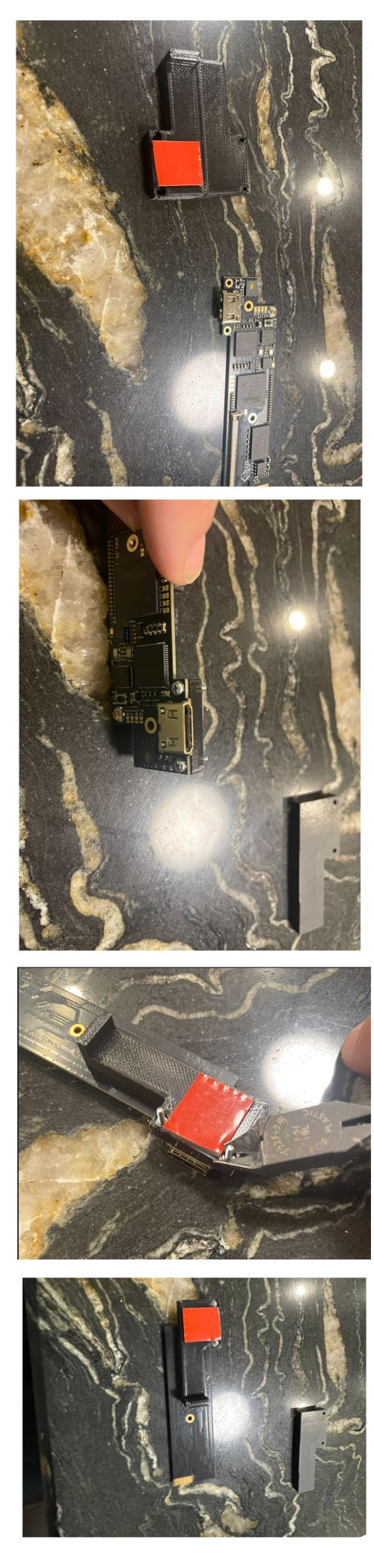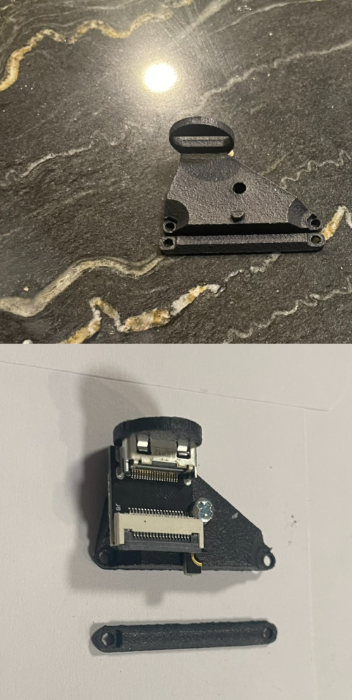 Snap the mounting bracket off the 3d printed panel by rocking back and forth. Use the M2 screw and nut to securely mount the female hdmi board as shown.