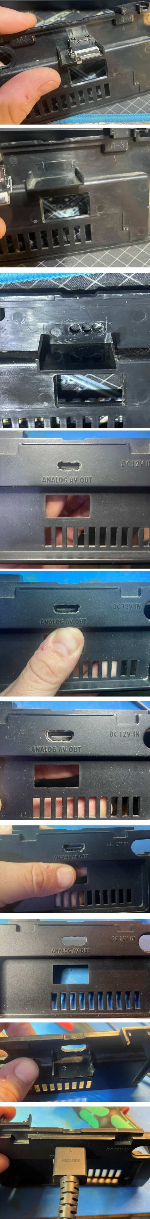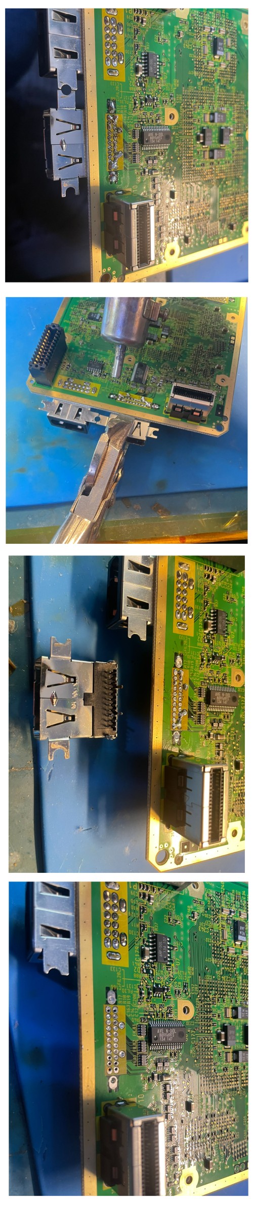One of the video ports needs to be removed if doing the no case cut. The way I like to remove the port is to flood it with fresh lead solder and then use a hot air tool to remove the port. With the pliers I keep a steady downward force while applying hot air at an angle towards the edge. Make sure to keep moving the hot air otherwise you risk damaging the FR4. The port will come right out. There are other ways to remove the port such as desolder gun, desolder braid, quick chip etc. Do what you feel most comfortable with.