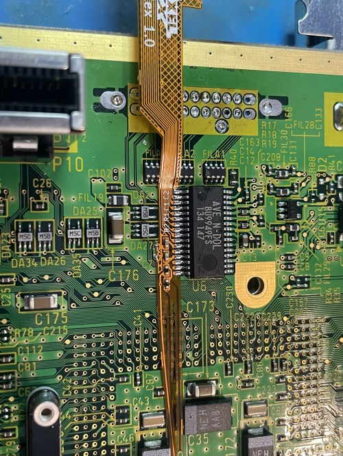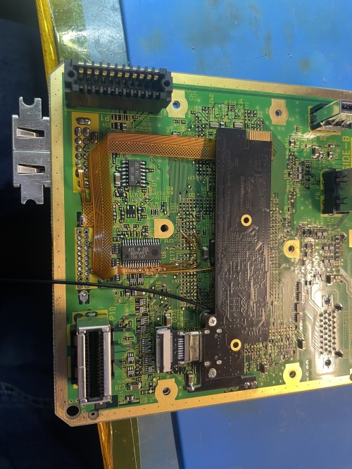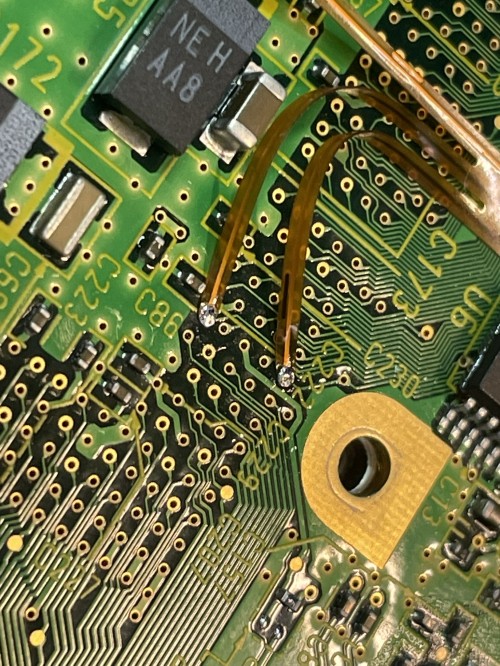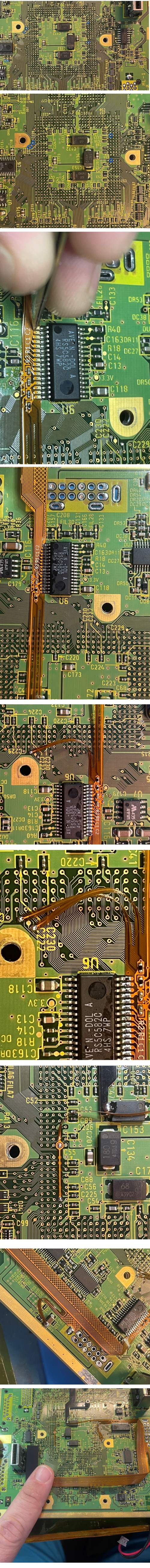 Align the main flex as shown and solder into place. Make sure to solder where you scraped by the capactiors.