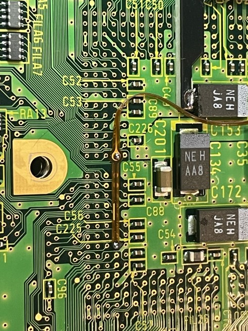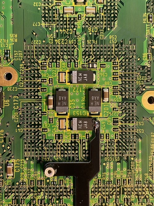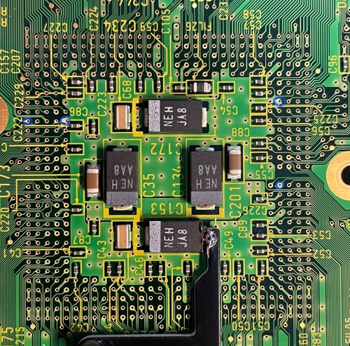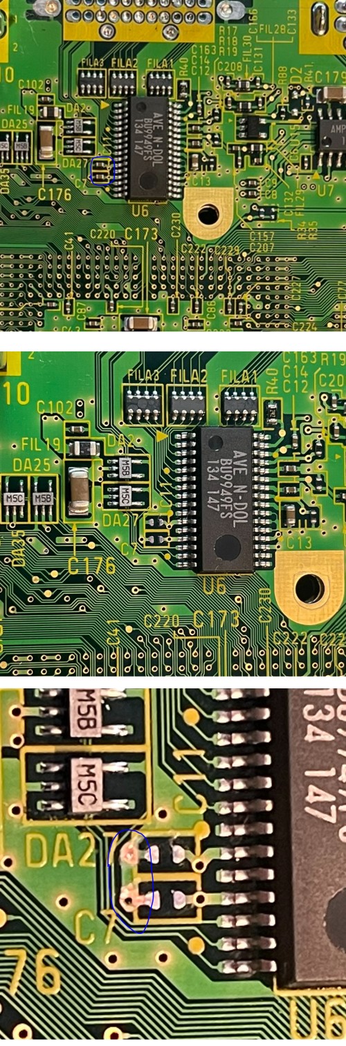 Remove the capacitors that are circled. Then use an exacto knife and remove the solder mask that is circled
