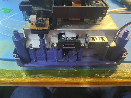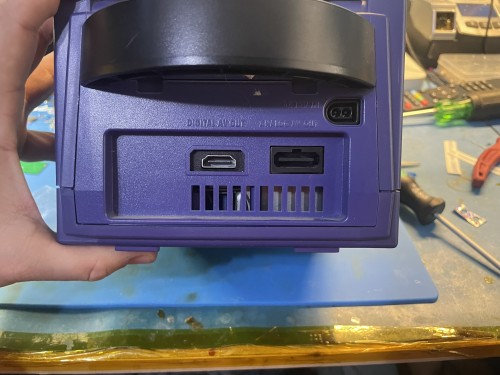 Once the motherboard is free (Leave the heatsink attached unless you plan to replace the thermal pads), set it to the side. We now need to decide which port you would like the HDMI to replace. This install will remove the the digital port in the DOL-001. Removing the analog port is also the same procedure.