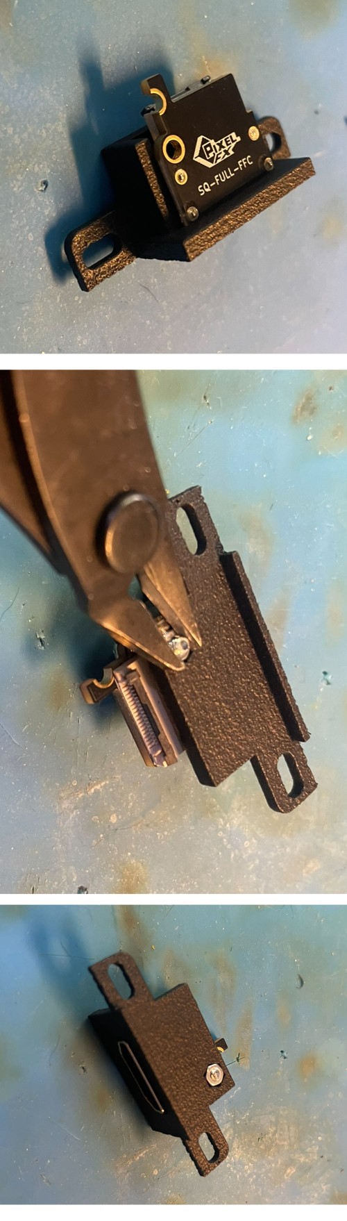 Install the mount as shown and then solder on the M1.6 screw boss. The pins are self aligning This will fit both 001 and 101 models.