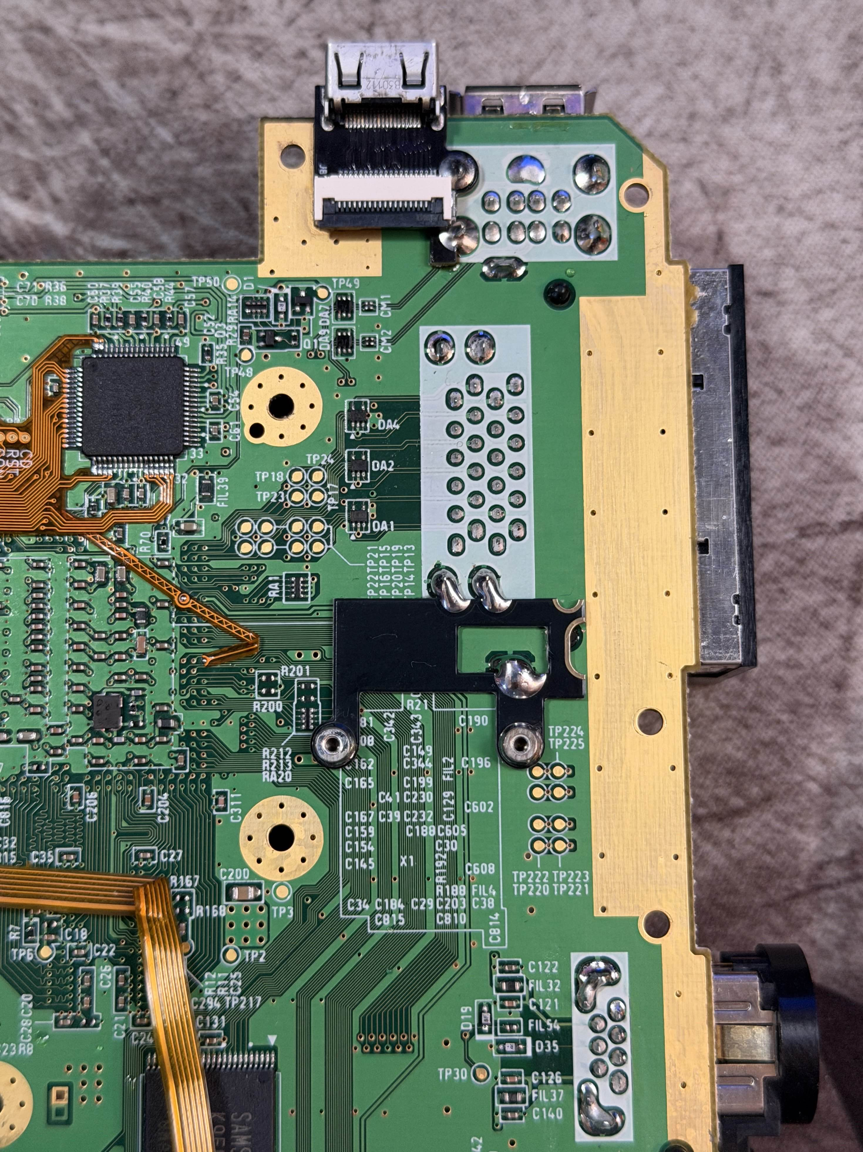 Install the Mini HDMI connector. Desolder some of the area around the points to get a better fitment. Make sure the PORT is flat and squared out with the console when attaching.