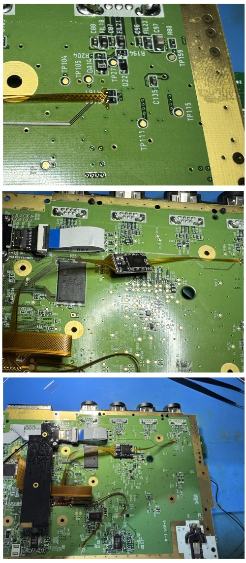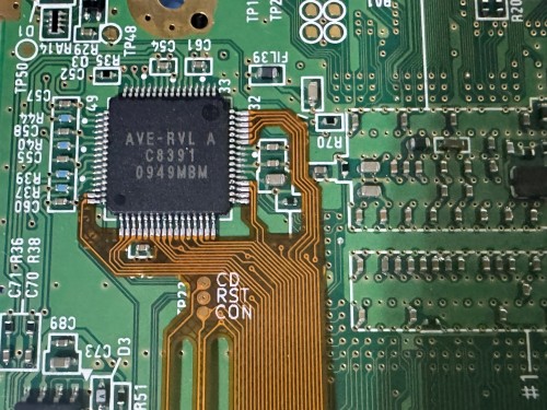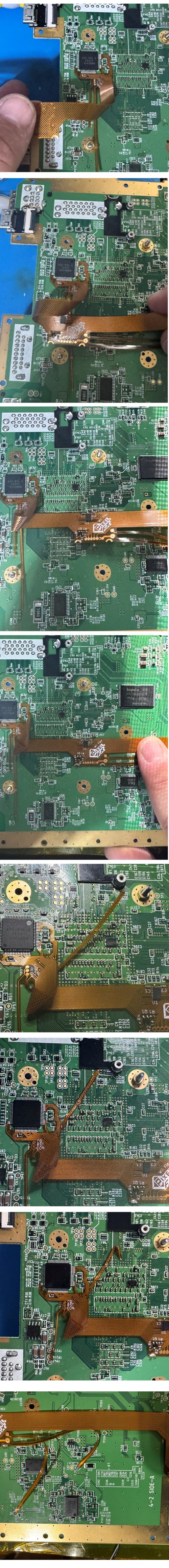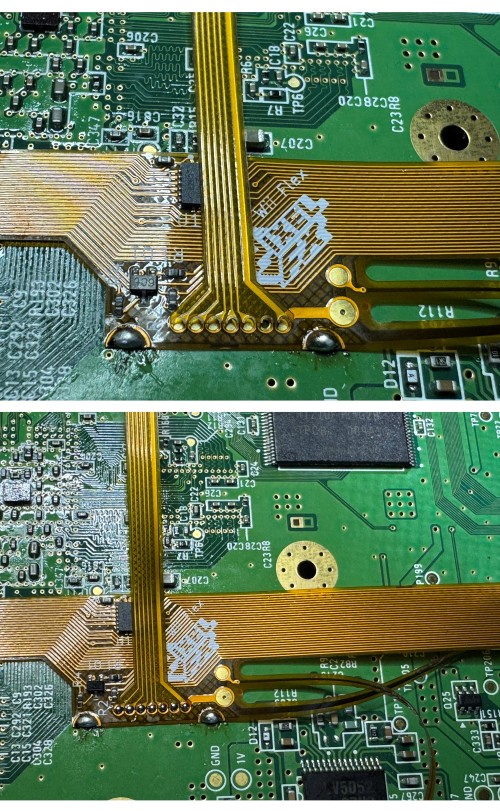 After soldering the Wii cable bend and secure as shown in the photos. Take note of the alignment of the flex cable with the Wii Motherboard screw area. Stay out of the gold mounting holes. The soldermask will have to be scraped for the two ground connections to the flex. Then solder all the flex arms to their corresponding points.