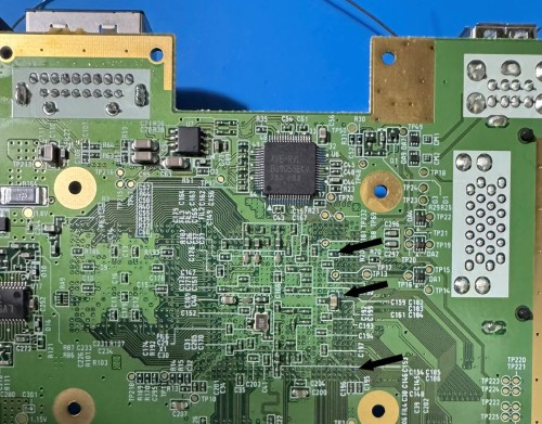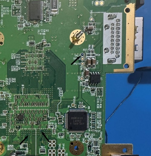 After soldering the Wii cable bend and secure as shown in the photos. Take note of the alignment of the flex cable with the Wii Motherboard screw area. Stay out of the gold circle as pointed out by the blue line. The soldermask will have to be scraped for the two ground connections to the flex. Then solder all the flex arms to their corresponding points.
